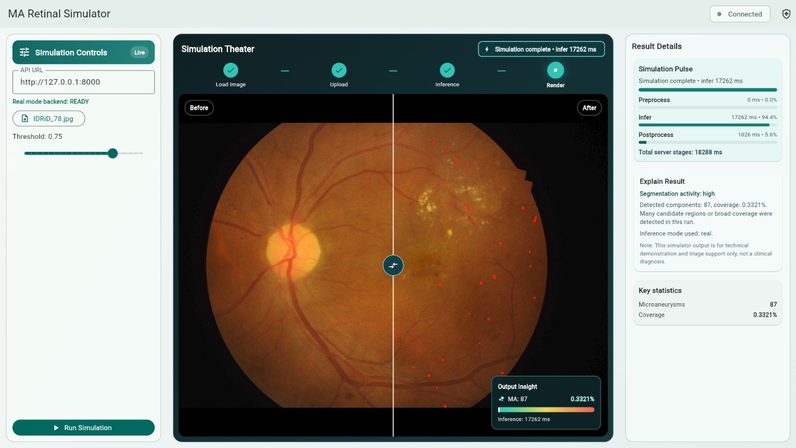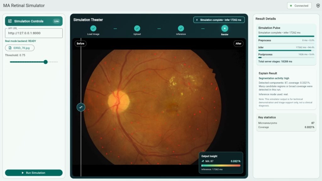 Retinexa menghadirkan teknologi segmentasi citra retina berbasis AI yang dikembangkan untuk meningkatkan ketepatan identifikasi area abnormal pada retina diabetes ringan. Dengan pendekatan yang efisien dan berbasis data citra medis, platform ini mendukung proses analisis yang lebih cepat, konsisten, dan informatif.